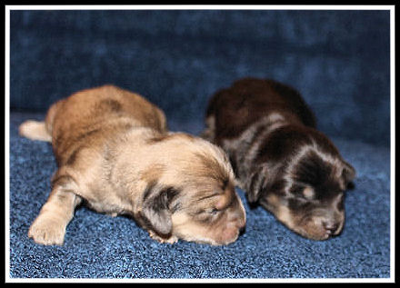 Trinity & Sterling have two stunning pups! Unfortunately the second one born took too long and didn't survive. This will be Trinity's first litter. Both long & smooth coats possible. We have a smooth blk/tan dapple female that carries for chocolate.